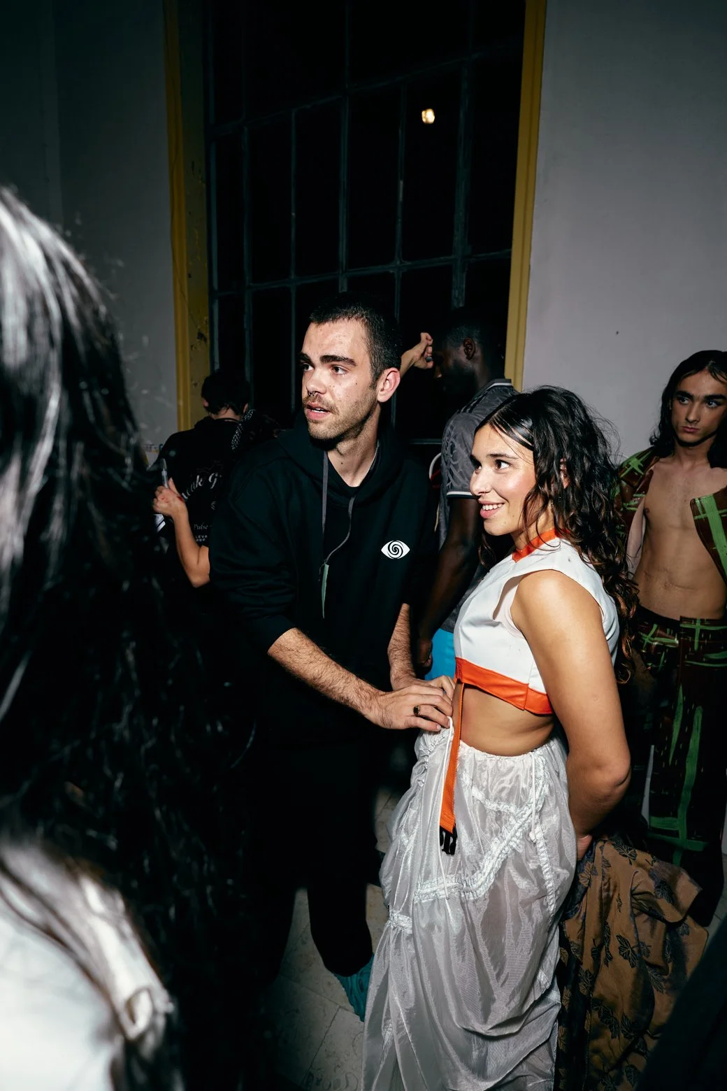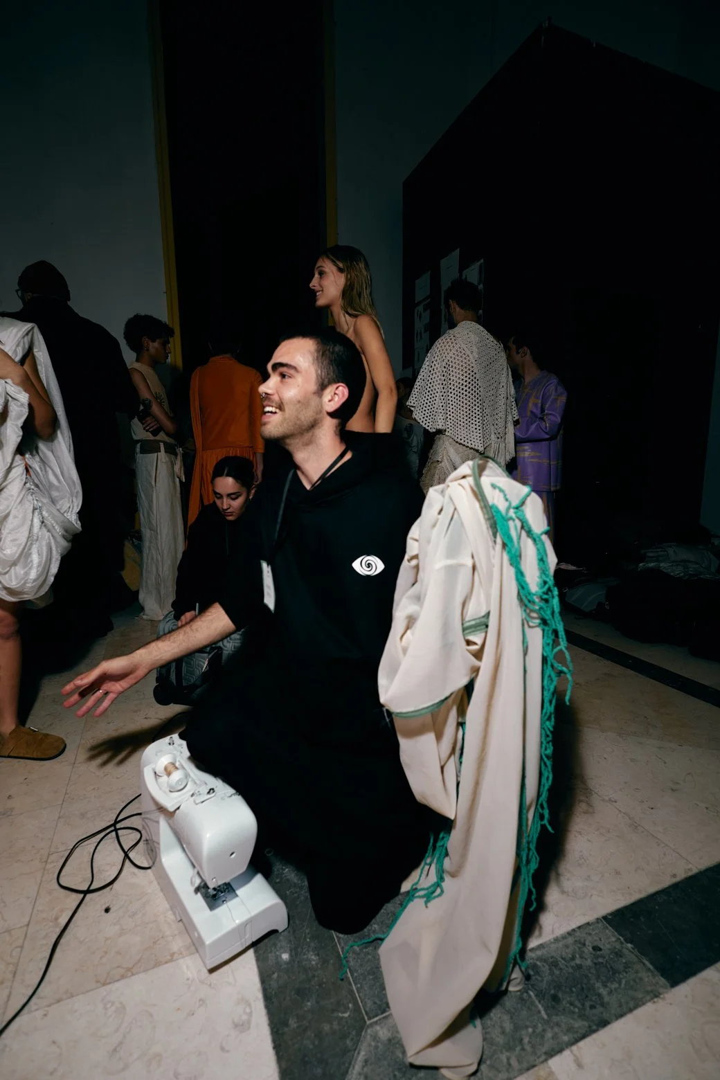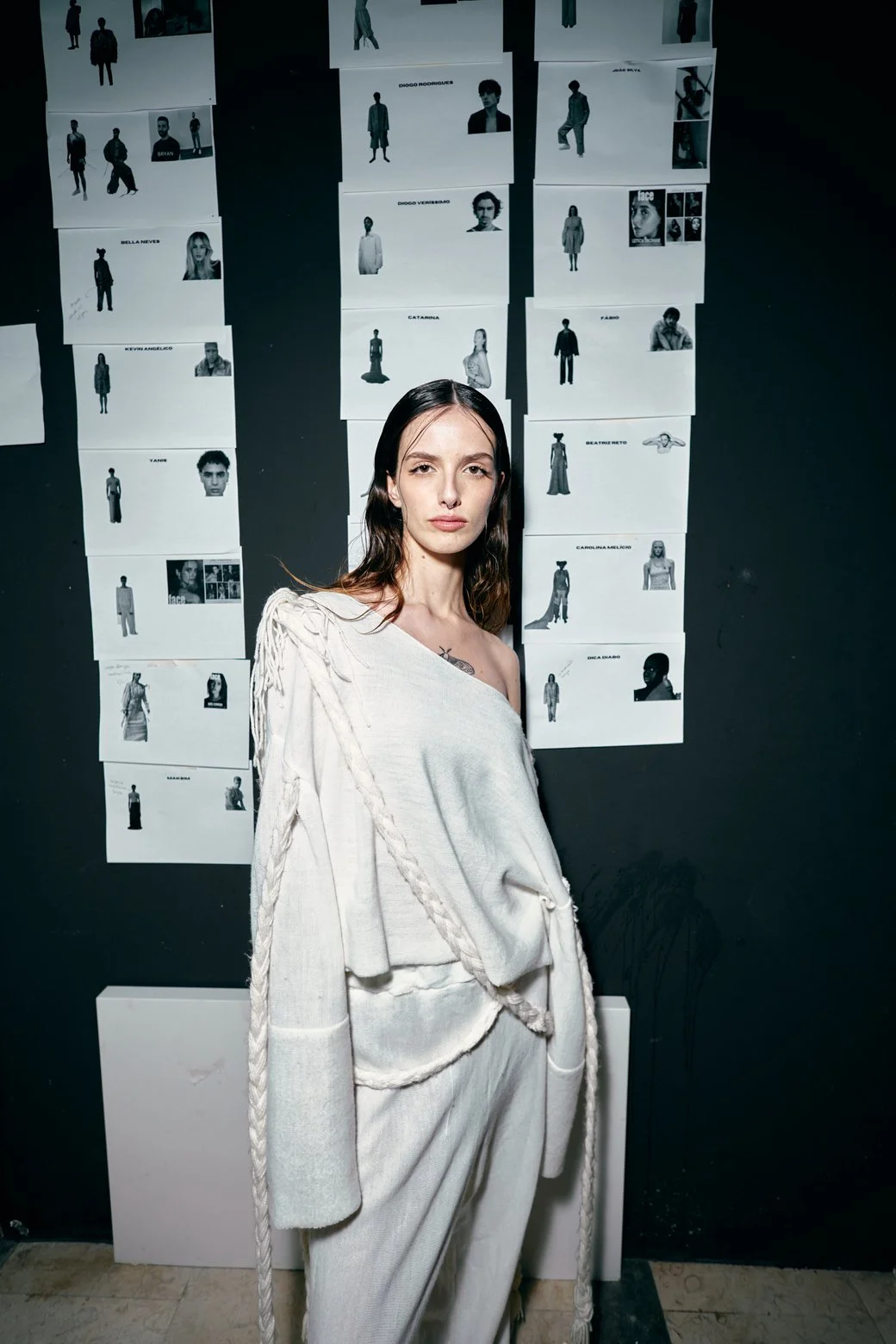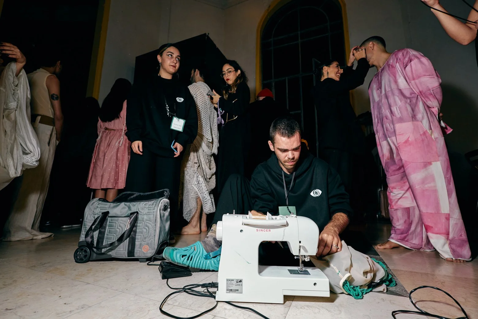 More than just a fashion show, EQUINOX provided an immersive experience for guests, mixing fashion, music, and performance: the soundtrack, created exclusively for the event, was performed live by musician Farwarmth (Afonso Arrepia Ferreira) on the keyboard; under the direction of Beatriz Pereira, a group of talented dancers brought movement and emotion to the collection; the makeup and hair, designed by artist Noir (Rita Oliveira), explored shapes and textures that complemented the disruptive and visionary aesthetic of the fashion show; and the participation of creatives such as Sara Diniz, who brought a unique artistic dimension to the event, was fundamental in highlighting the essence of the collection.